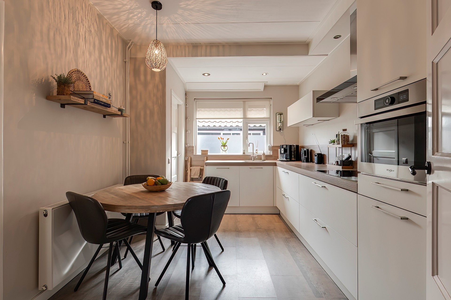 Begane grond: Betreed de woning via de hal met toilet, meterkast met toegang tot de kelder en trap naar de eerste verdieping. Stap vervolgens de lichte woonkamer binnen voorzien van een massief eiken vloer. De gesloten keuken heeft een L-opstelling met inbouwapparatuur: vaatwasser, koelkast, inductiekookplaat, afzuigkap en combimagnetron. Via de keuken kom je in een portaal die toegang geeft tot de tuin.