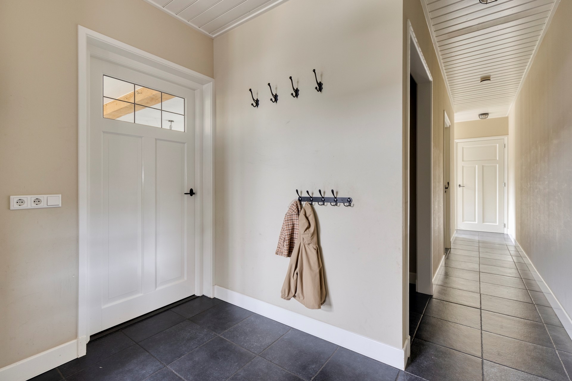 Via de karakteristieke voordeur van de woonboerderij stap je binnen in de royale hal die direct een gevoel van ruimte geeft. Hier vind je een garderobe, toiletruimte, meterkast, badkamer, berging, een praktische bergkast en de trapopgang naar de eerste verdieping.