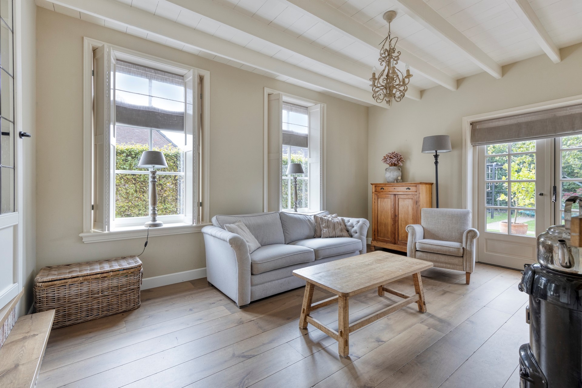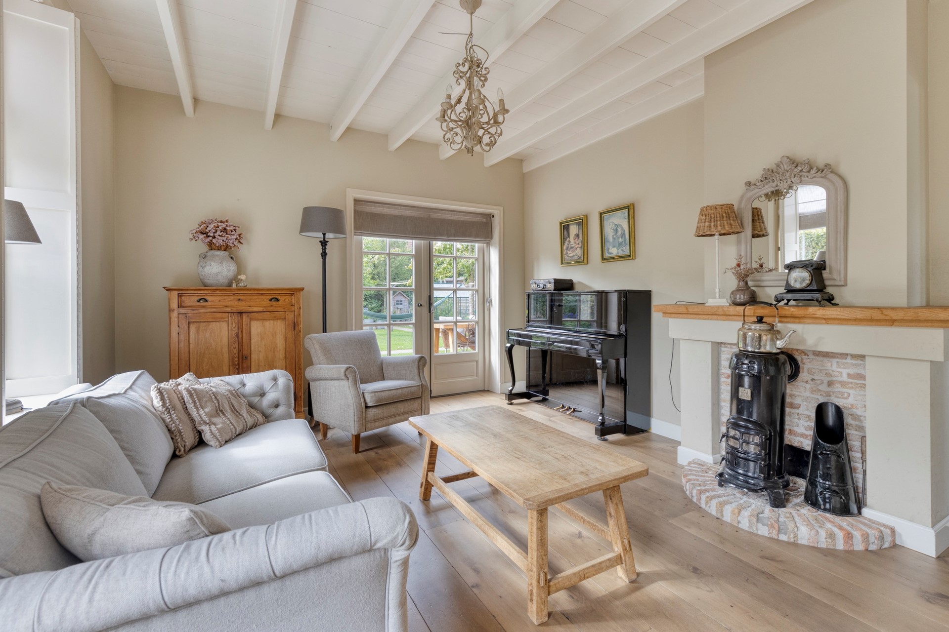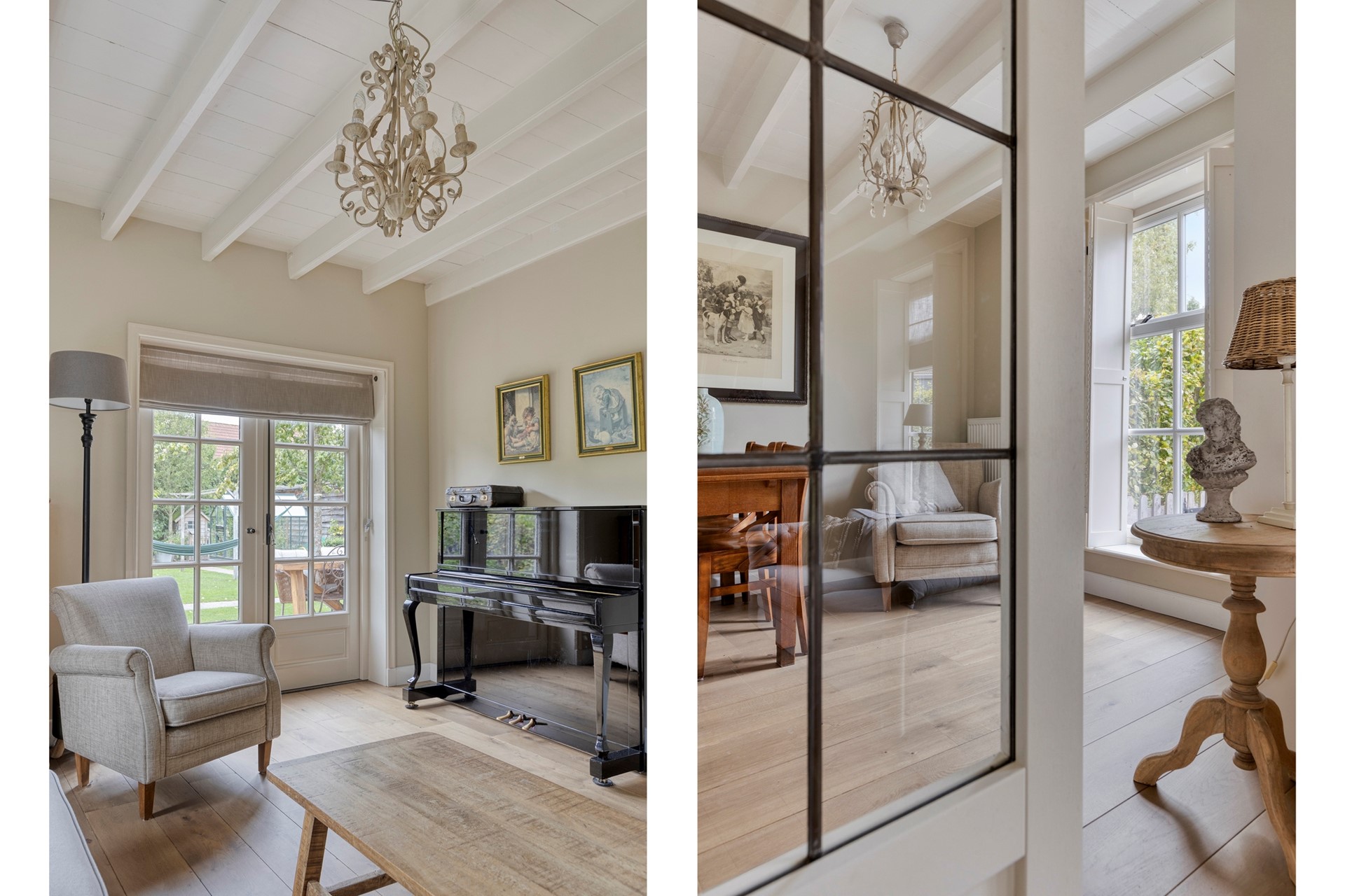 Via de keuken loop je door naar de woonkamer die voorzien is van een houten vloer en een rookkanaal en heeft voor een gezellige houtkachel. De woonkamer heeft terrasdeuren welke toegang geven tot de tuin. De opkamer, bereikbaar via een trapje vanuit de woonkamer en voorzien van klapdeuren biedt een extra ruimte die perfect is als werkplek, leeshoek of speelkamer. De ramen zijn voorzien van “ouderwetse” binnen luiken wat nog meer sfeer geeft aan het woongenot.