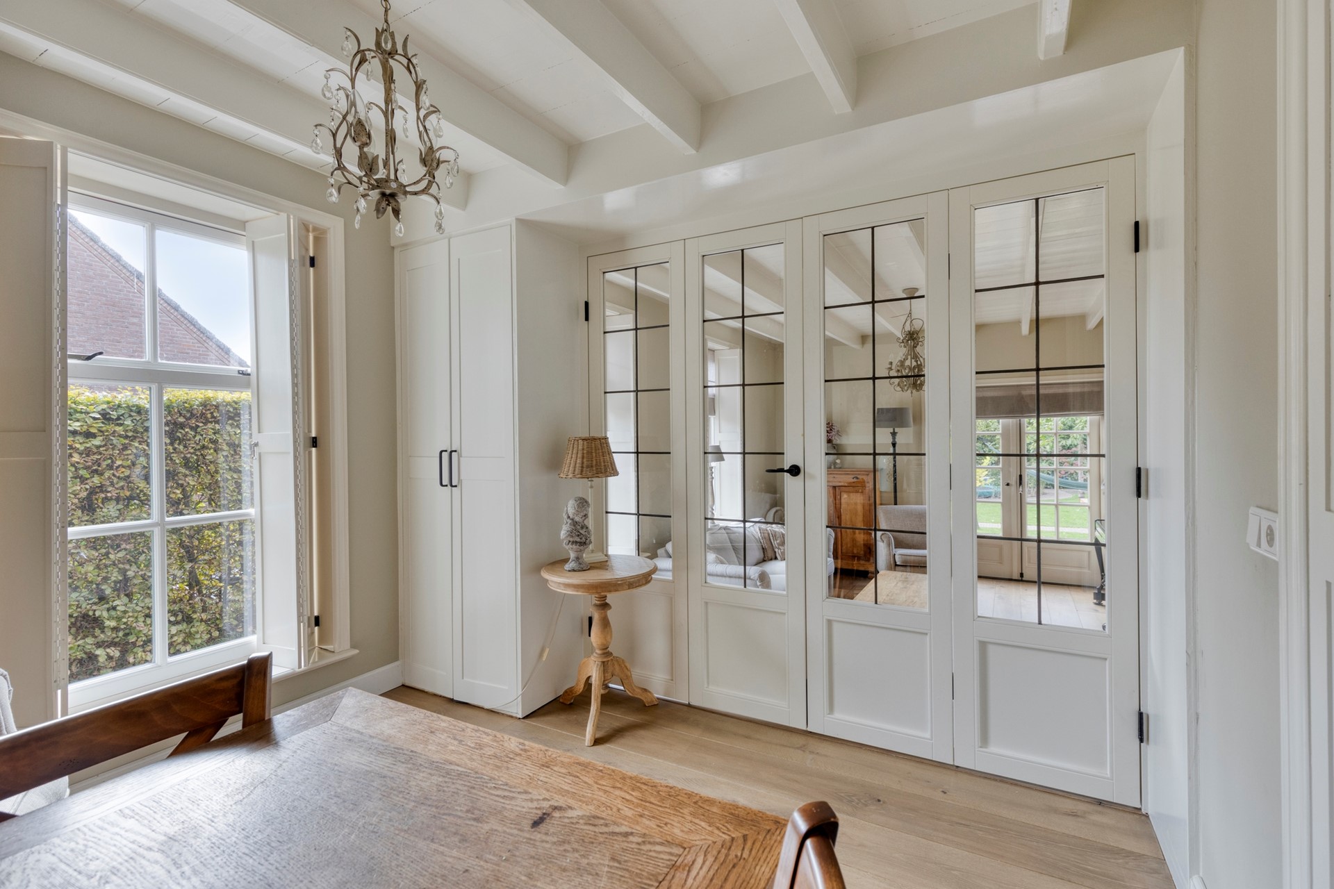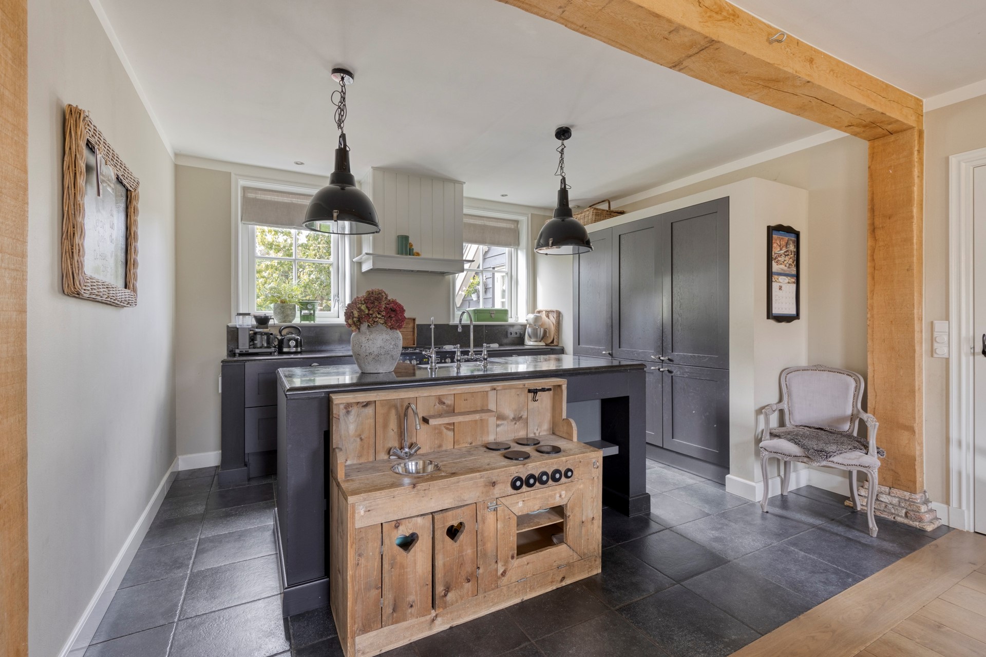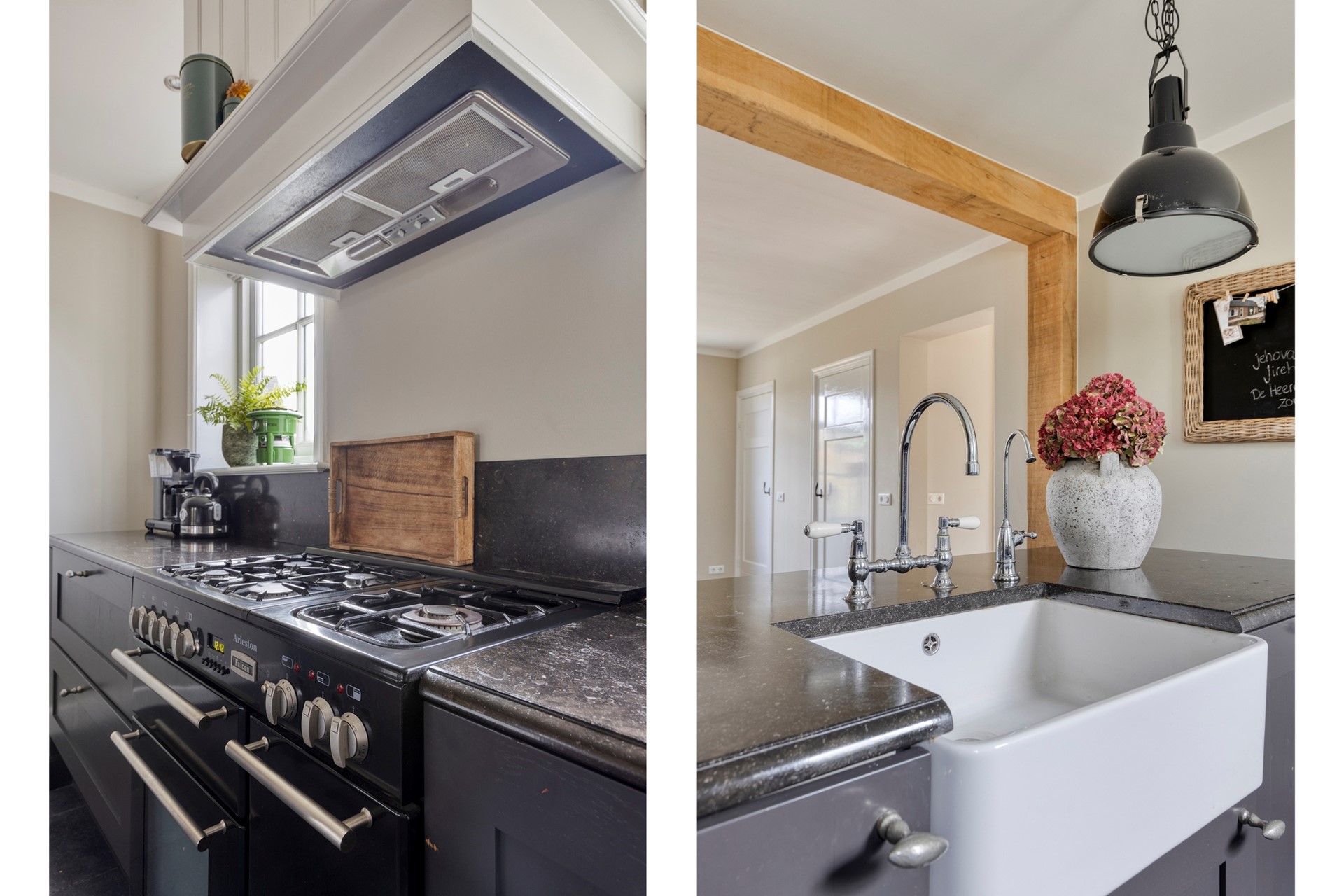 De hal geeft toegang tot de landelijke woonkeuken met eiland voorzien van inbouwapparatuur, te weten gasfornuis, afzuigkap, oven, koelkast en vaatwasser. De keuken heeft voldoende kastruimte. De royale eetkeuken is dé plek waar gezin, familie en vrienden samenkomen. Voorzien van alle gemakken en toegang tot een handige provisiekelder.