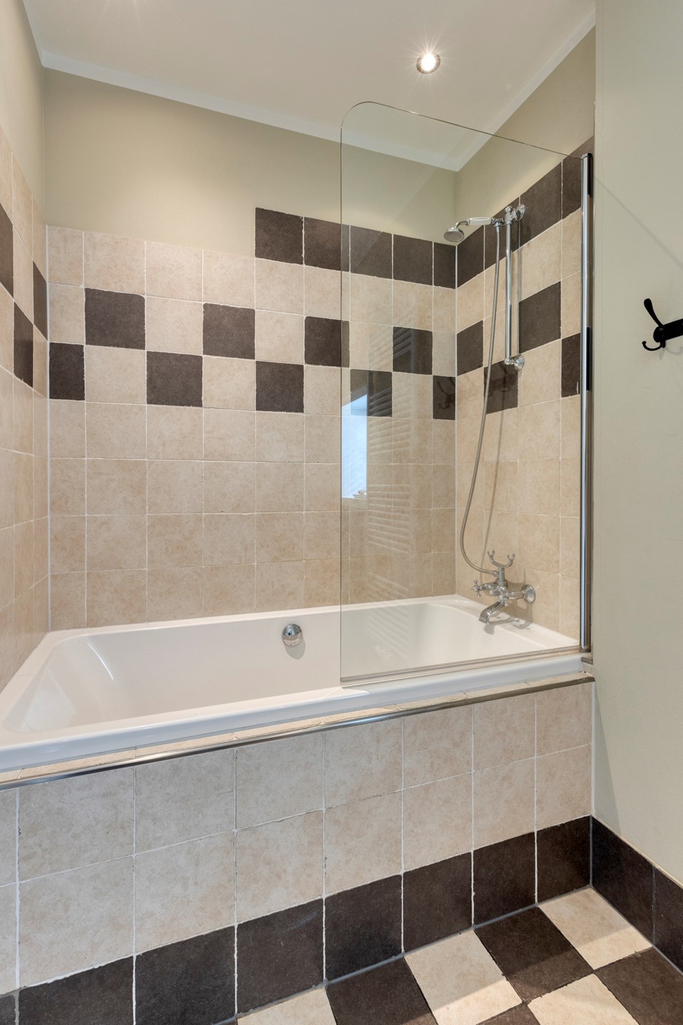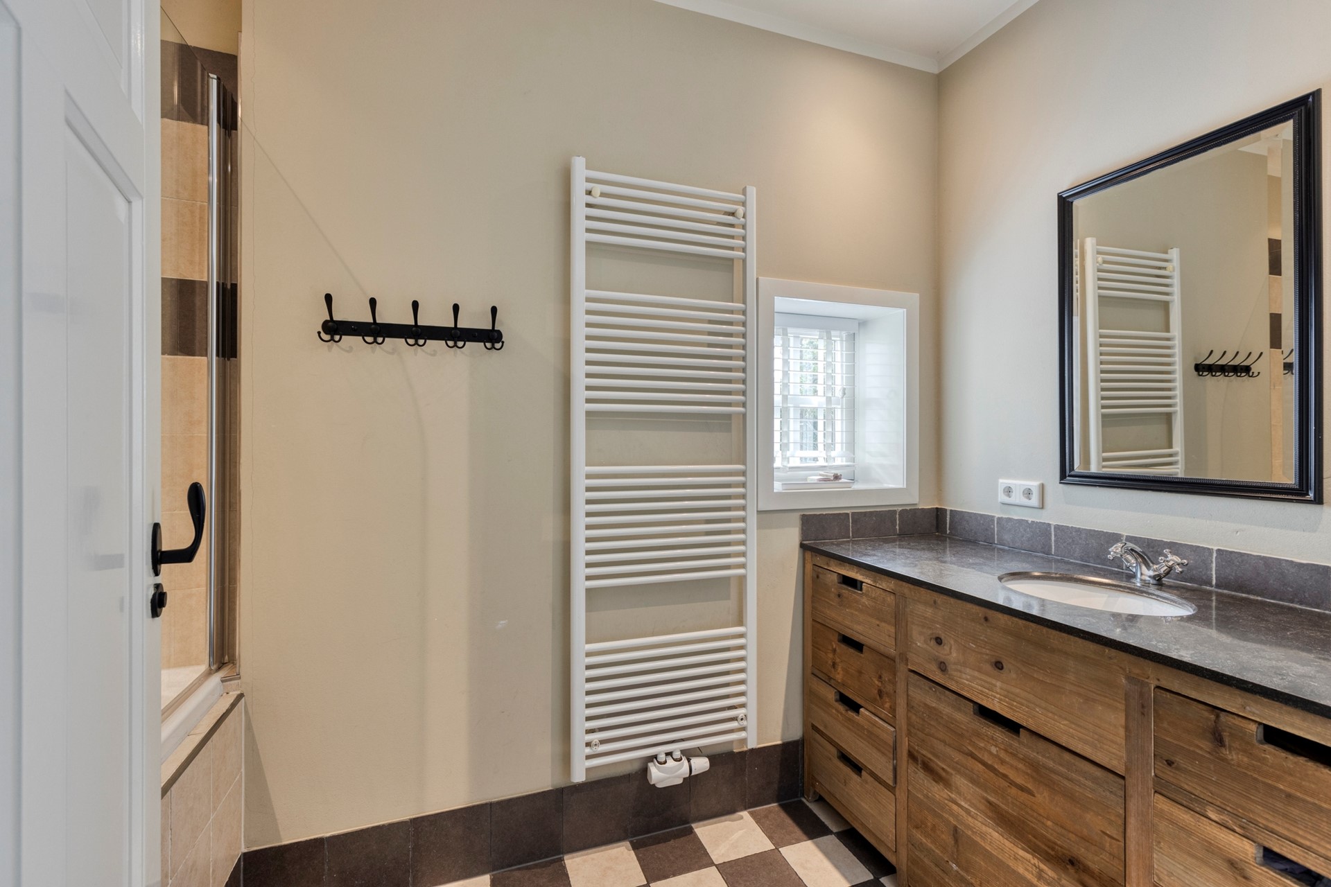 De badkamer op de begane vloer heeft een bad met douchevoorziening, wastafel met meubel en een designradiator.