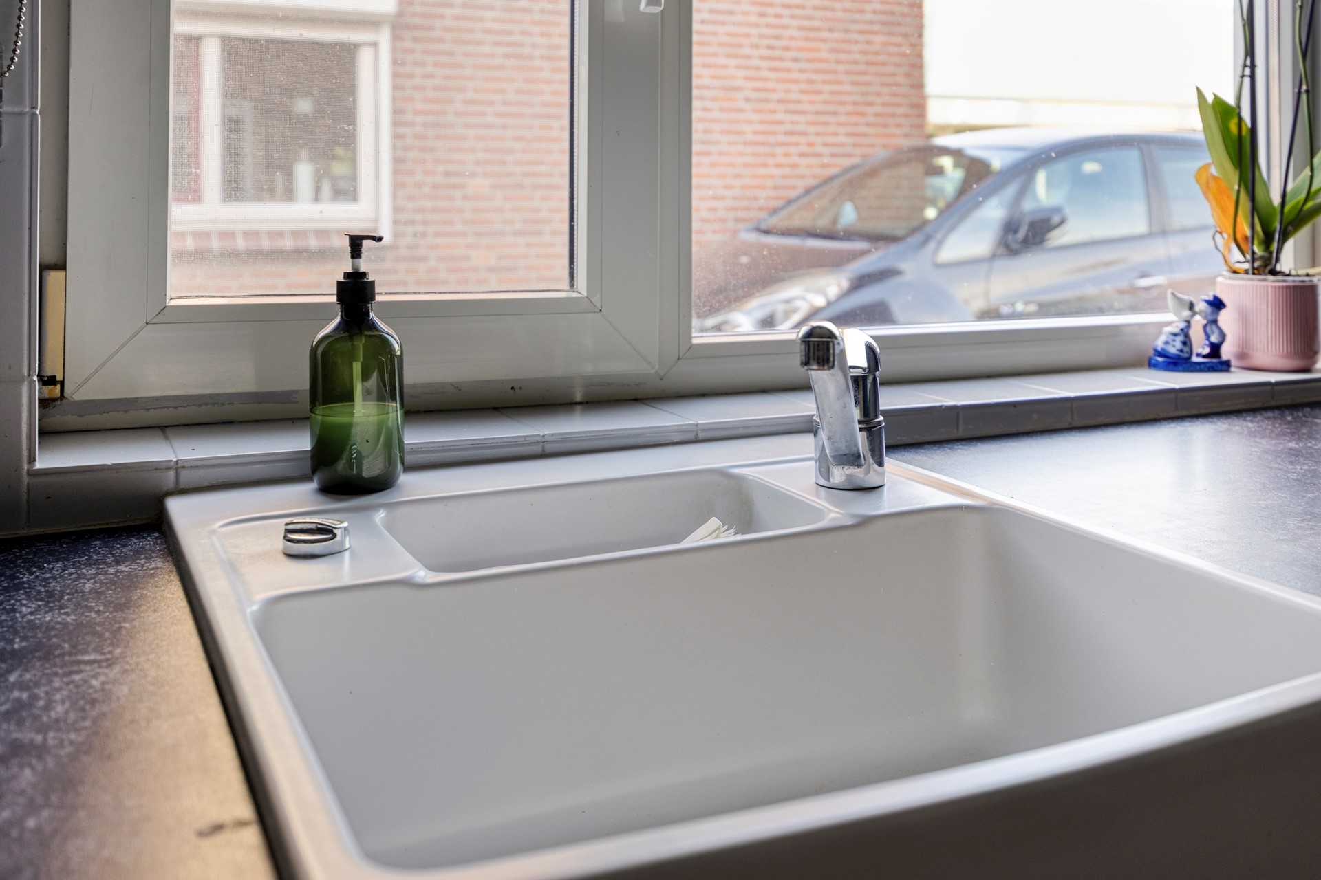 Je komt binnen in de hal met trapopgang naar de eerste verdieping en een praktische trapkast voor extra bergruimte. Vanuit de hal bereik je de centraal gelegen keuken, die toegang biedt tot zowel de woonkamer als de bijkeuken.